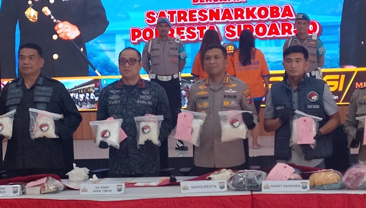 KORANSIDOARJO.ID,- Aparat Satuan Reserse Narkoba Polresta Sidoarjo, Jawa Timur, berhasil menangkap dua wanita cantik asal Kabupaten Sidoarjo yang diduga menjadi bagian dari jaringan pengedar narkoba internasional. Keduanya diamankan bersama barang bukti sabu seberat 8,2 kilogram dengan nilai mencapai Rp 9,2 miliar.
