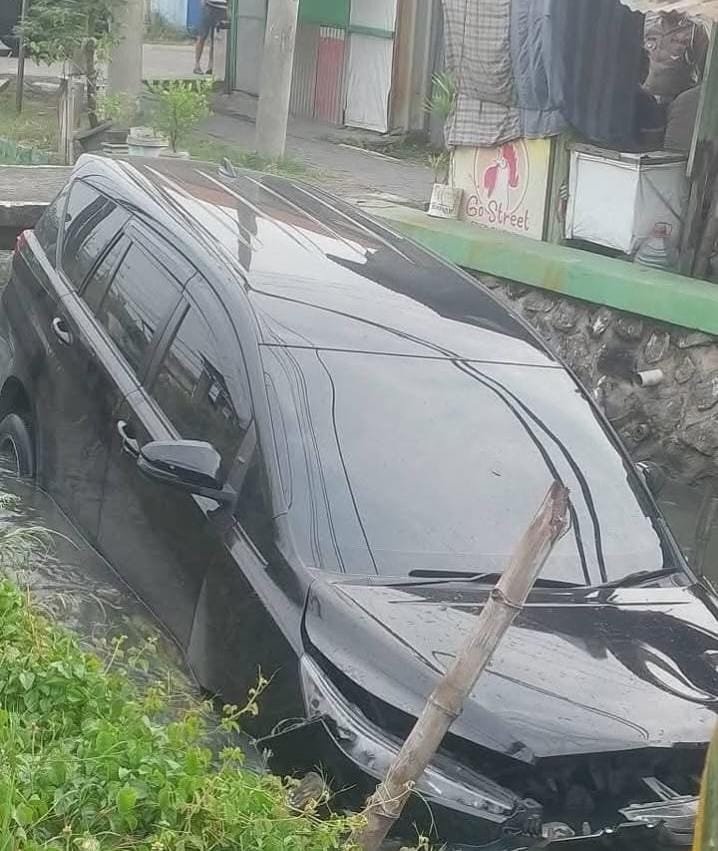 Mobil diduga hilang kendali, sehingga menabrak trotoar di kiri jalan. Benturan keras membuat mobil seketika terjun ke sungai di sisi timur jalan. Beruntung tak ada korban akibat peristiwa tersebut.